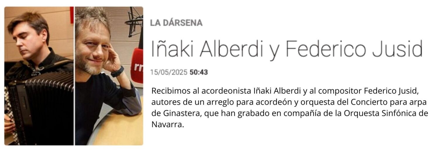 The album Ginastera is an arrangement for accordion and orchestra of Alberto Ginastera’s Concerto for Harp and Orchestra, Op. 25, performed by Iñaki Alberdi and conducted by Federico Jusid with the Navarre Symphony Orchestra.